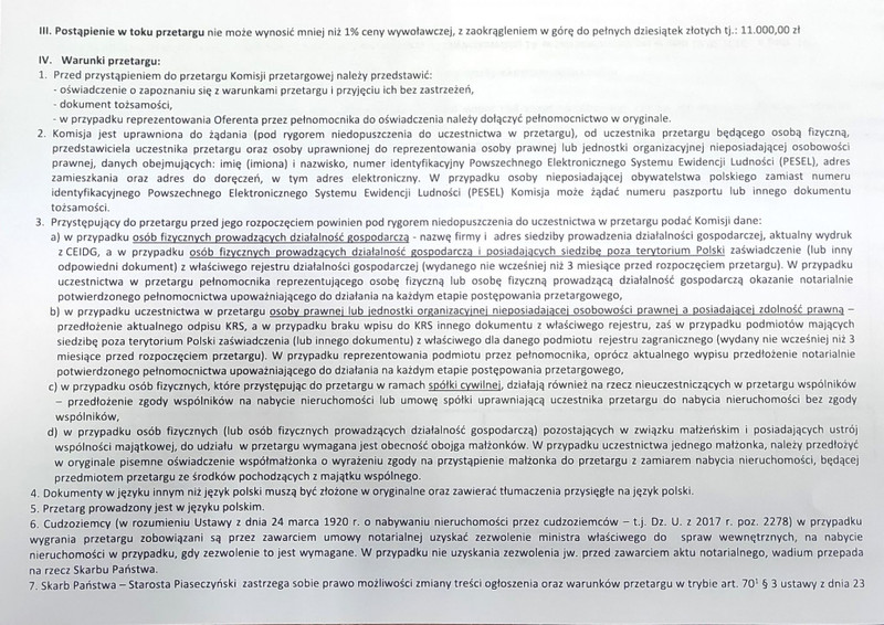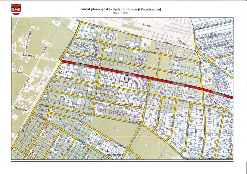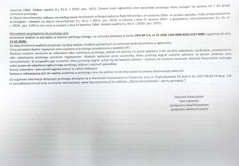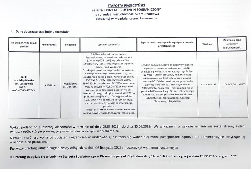 Działka jest położona bezpośrednio w stosunku do drogi publicznej klasy wojewódzkiej 1 KDG/KDZ (ul. Słoneczna), bez urządzonego zjazdu z drogi (na wniosek Skarbu Państwa-Starosty Piaseczyńskiego w dniu 19.07.2023r. została przez MZDW w Warszawie wydana decyzja nr 70/RD-8/2023 w sprawie zezwolenia na lokalizację zjazdu). Najbliższe sąsiedztwo działki stanowi zabudowa mieszkaniowa jednorodzinna oraz tereny leśne. Zgodnie z obowiązującym miejscowym planem zagospodarowania przestrzennego działka znajduje się w obszarze oznaczonym symbolem 10 MNe – „teren zabudowy mieszkaniowej ekstensywnej na działkach zadrzewionych i zalesianych”. Działka stanowi własność Skarbu Państwa i podlega zbyciu w drodze przetargu ustnego nieograniczonego. Szczegółowe informacje na temat przetargu znajdują się w załączonym ogłoszeniu oraz na stronie internetowej Powiatu Piaseczyńskiego w BIP - bip..