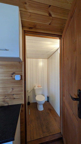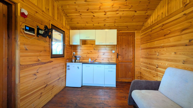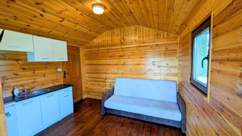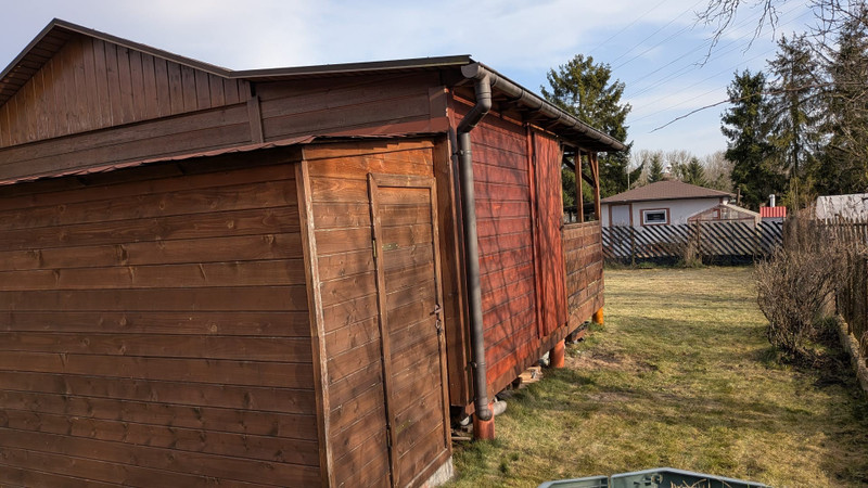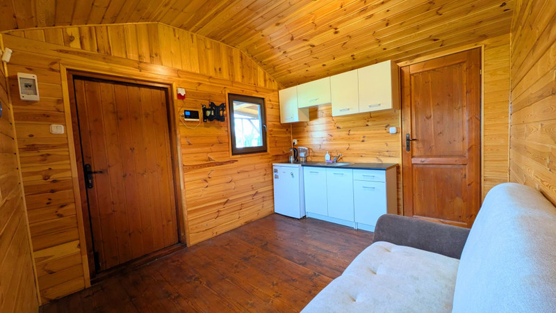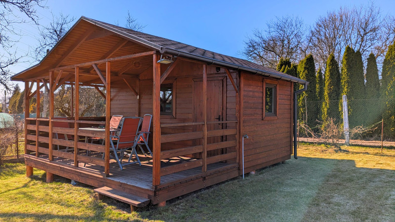 Na działce znajduję się duży drewniany domek wypoczynkowy w którym są: