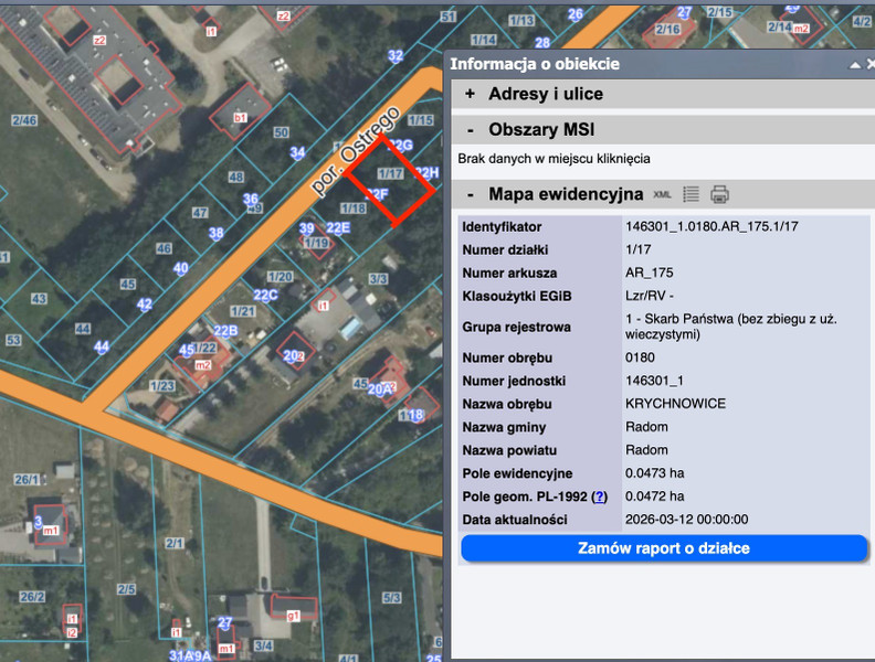 Na sprzedaż działka o powierzchni 473 m² położona w Radomiu w dzielnicy Krychnowice, przy ul. por. Ostrego. Nieruchomość oznaczona w ewidencji gruntów jako działka nr 1/17, obręb 0180 Krychnowice.