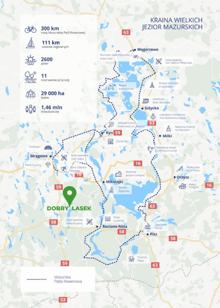 Świetna dostępność: Mikołajki, Giżycko, Mrągowo, Ryn, Ruciane-Nida, Olsztyn (ok. 1 h)
