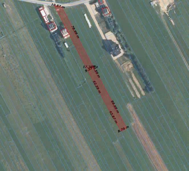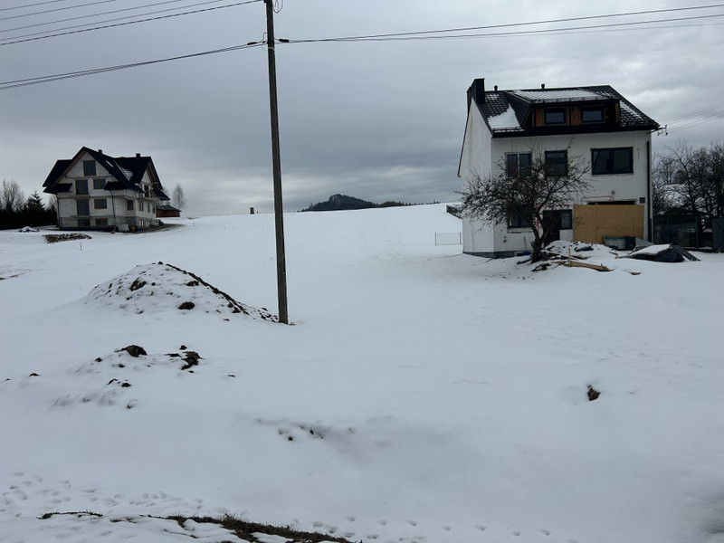 Na sprzedaż działka 1684 m² w spokojnej, widokowej okolicy, z luźną zabudową w sąsiedztwie. Otwarta przestrzeń i ładny widok na okoliczne wzniesienia. Działka ma wydłużony kształt – ok. 190 m długości, front ok. 10,9 m, szerokość ok. 8,7–10.9m.