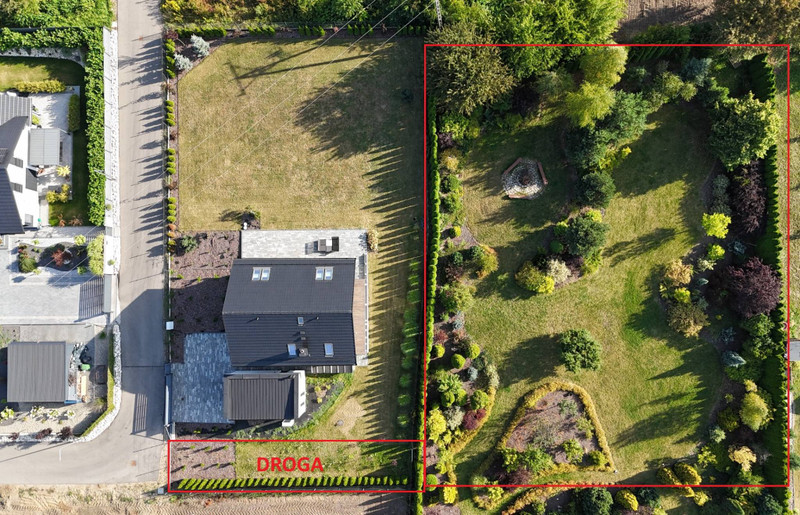 Działka jest duża i szeroka – 18 arów (z drogą). Działka około 38x44m. Dojazd utwardzoną drogą z ulicy Polne Wzgórze, w której znajdują się wszystkie media.