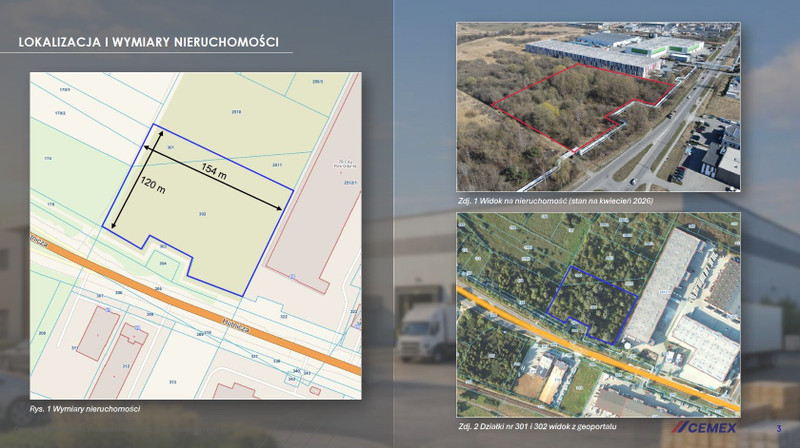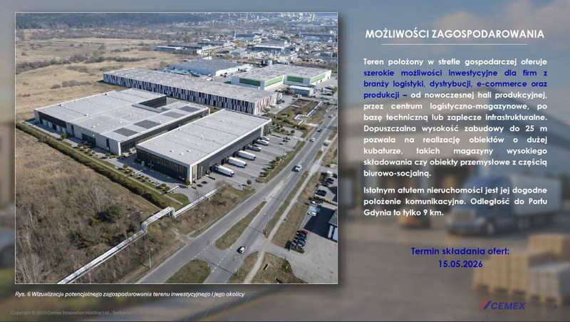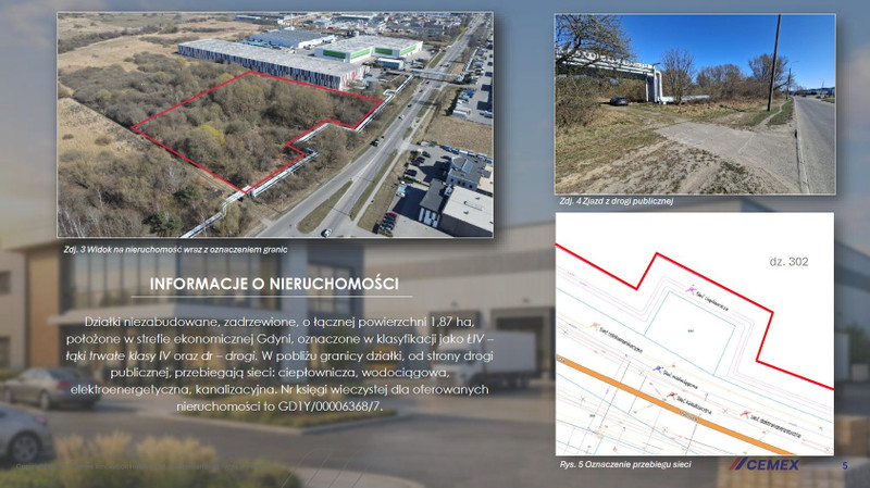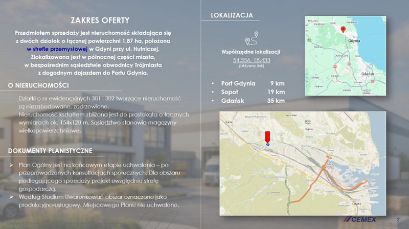 Przedmiotem sprzedaży jest nieruchomość składająca się z dwóch działek o łącznej powierzchni 1,87 ha, położona w strefie przemysłowej w Gdyni przy ul. Hutniczej.