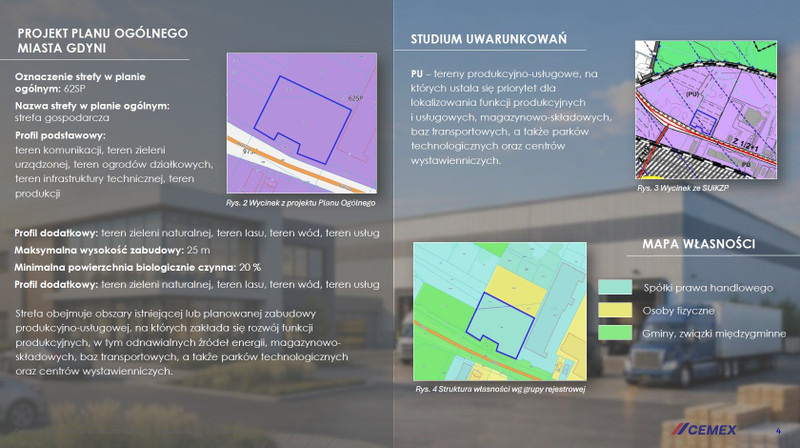 Plan Ogólny jest na końcowym etapie uchwalania – po przeprowadzonych konsultacjach społecznych. Dla obszaru podlegającego sprzedaży projekt uwzględnia strefę gospodarczą.
