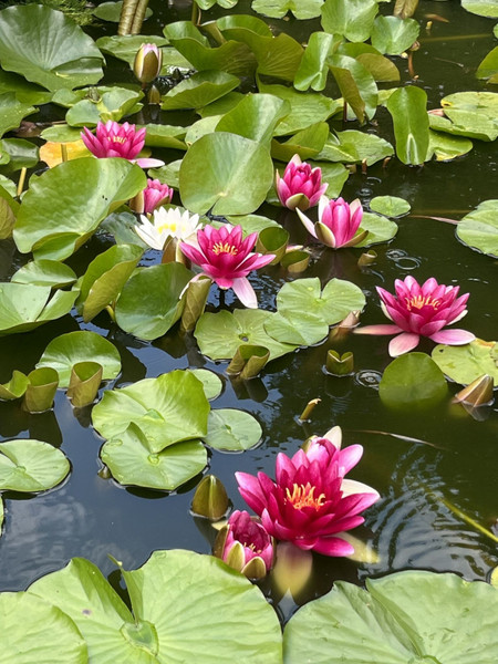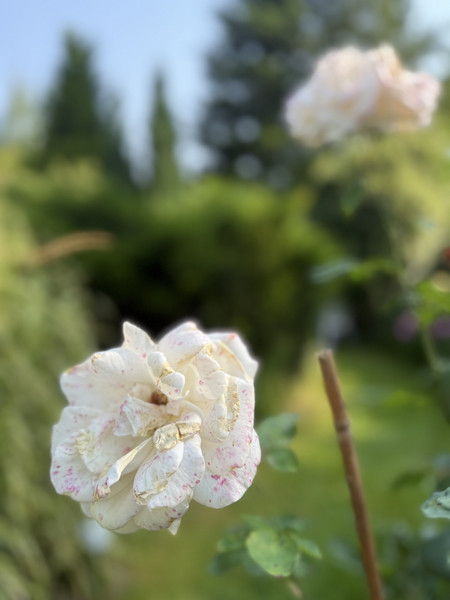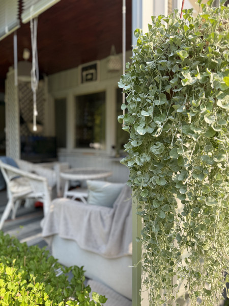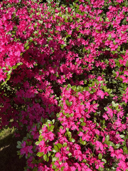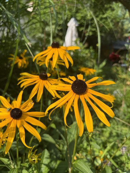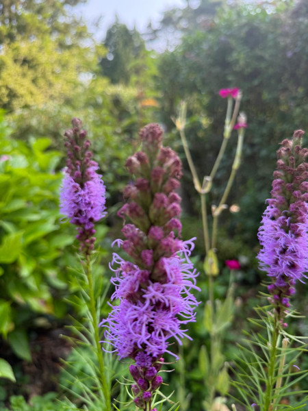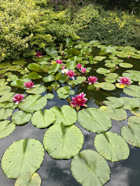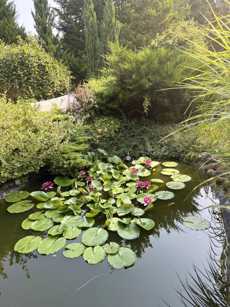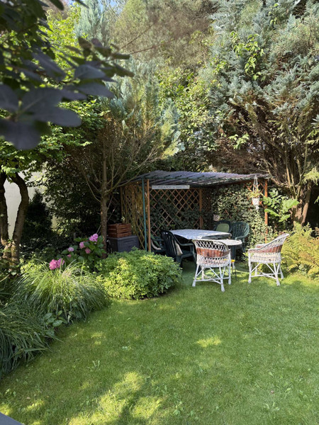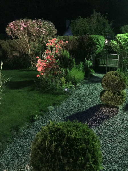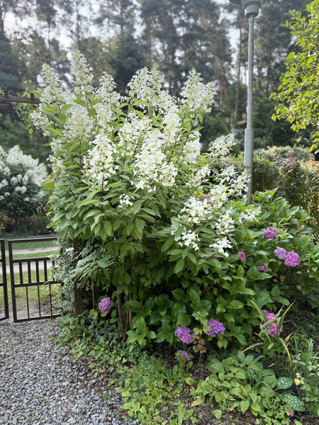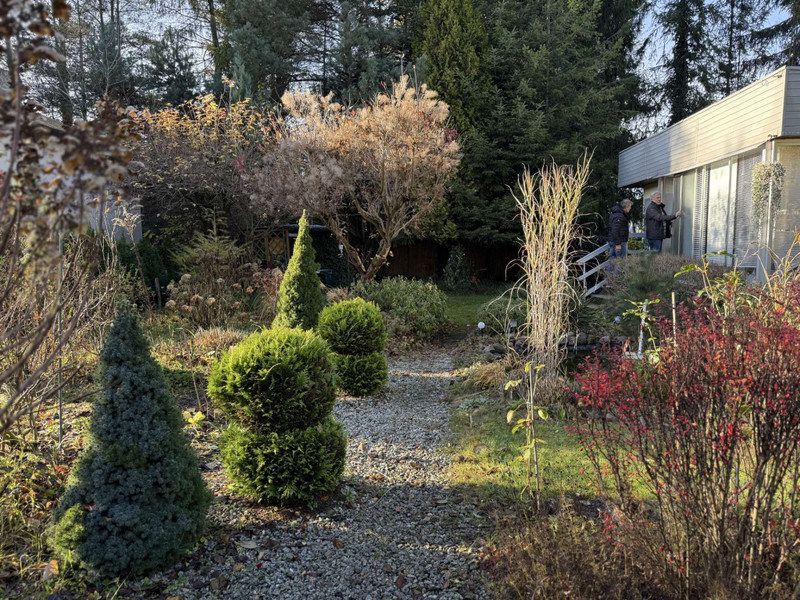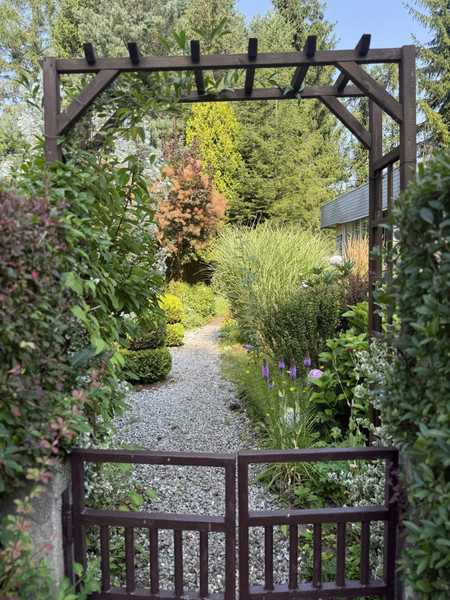 Cała działka jest zielona z mnóstwem krzewów, drzew i kwiatów.