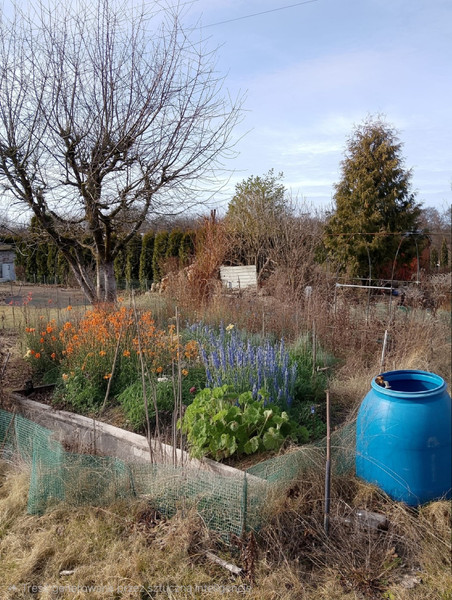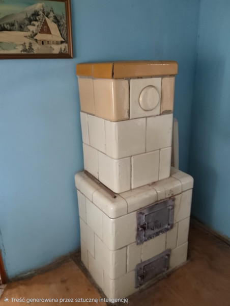 Na działce znajduje się mały piętrowy domek, z pokojem z piecem kaflowym, kuchnią, ubikacją, a na górze pokój z pomieszczeniem gospodarczym.