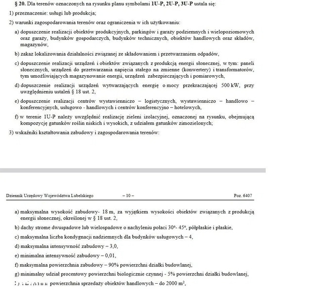 Działka przeznaczona pod aktywność gospodarczą oznaczenie 1 PU z podstawowym przeznaczeniem gruntów pod: obiekty produkcyjne, składy i magazyny oraz zabudowa usługowa. - maksymalna wysokość budynków 15 m - pow. zabudowy do 70 %.