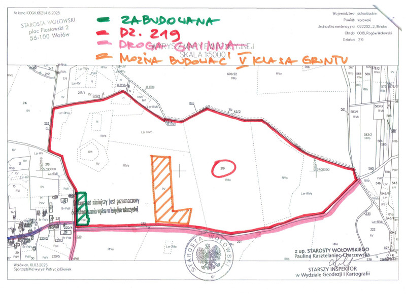 Około 33 ha w dobrej kulturze rolnej, uprawiane. Około 6 ha do odkrzaczenia. Około 0,50 ha zabudowane (kolor zielony). Na około 2,5 ha możliwość zabudowy zagrodowej – ziemia kl. V z dostępem do drogi gminnej (kolor pomarańczowy). Możliwość dokupienia sąsiadującego folwarku z dworem, stajniami i parkiem.