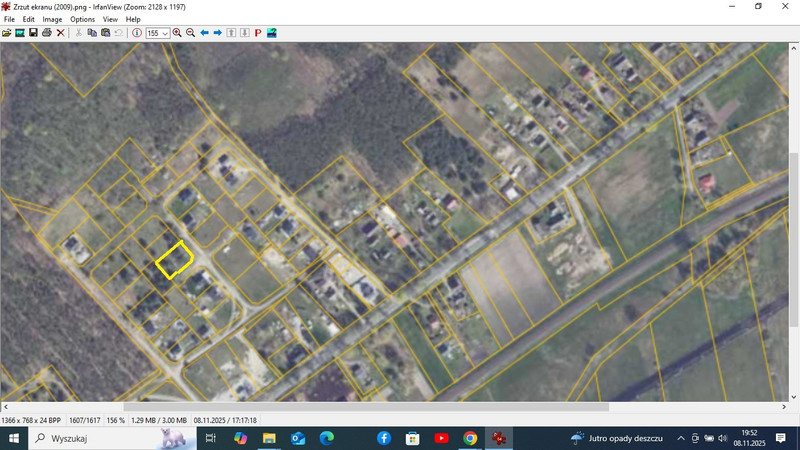 Maksymalna powierzchnia zabudowy dla budynku mieszkalnego, dla tej działki, to około 75-85 m2, plus dodatkowo około 60 m2 dla budynku niemieszkalnego. Powierzchnia zabudowy jest wyznaczona przez rzut pionowy zewnętrznych krawędzi budynku na powierzchnię terenu, w przybliżeniu = powierzchni zajętej przez fundamenty. Dokładne dane muszą być wymierzone przez geodetę.