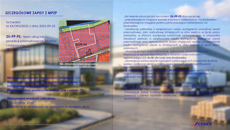 Obowiązujący Miejscowy Plan (MPZP) – wskazany teren usług lub produkcji przemysłowej lub składów i magazynów. W Studium Uwarunkowań uwzględnia kierunek przemysłowo-usługowy. Plan Ogólny na etapie projektowania. Działka niezabudowana o powierzchni 1,65 ha, zadrzewiona, położona