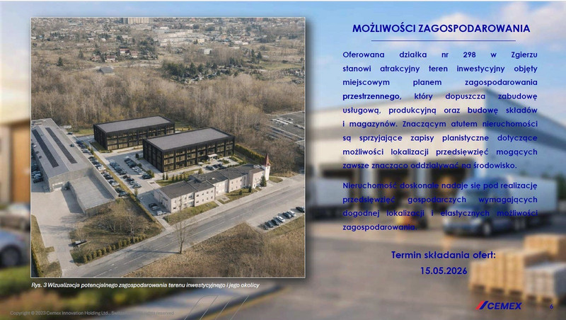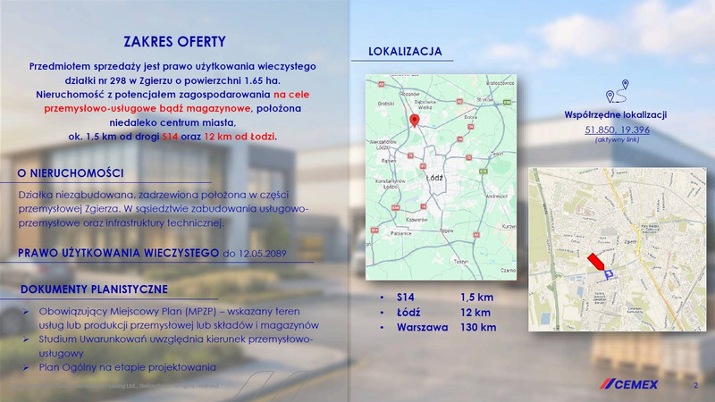 Przedmiotem sprzedaży jest prawo użytkowania wieczystego działki nr 298 w Zgierzu o powierzchni 1.65 ha.