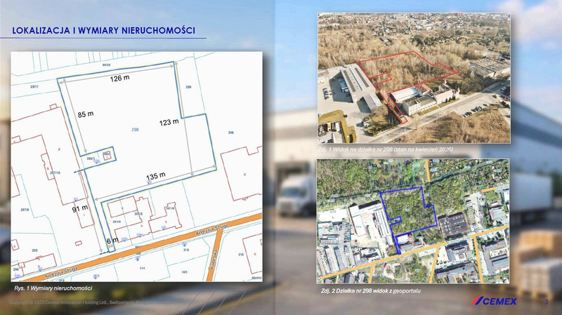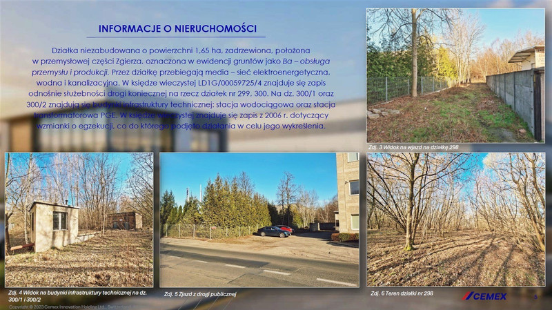 w przemysłowej części Zgierza, oznaczona w ewidencji gruntów jako Ba – obsługa przemysłu i produkcji. Przez działkę przebiegają media – sieć elektroenergetyczna, wodna i kanalizacyjna. W księdze wieczystej LD1G/00059725/4 znajduje się zapis odnośnie służebności drogi koniecznej na rzecz działek nr 299, 300. Na dz. 300/1 oraz 300/2 znajdują się budynki infrastruktury technicznej: stacja wodociągowa oraz stacja transformatorowa PGE. W księdze wieczystej znajduje się zapis z 2006 r. dotyczący wzmianki o egzekucji, co do którego podjęto działania w celu jego wykreślenia.