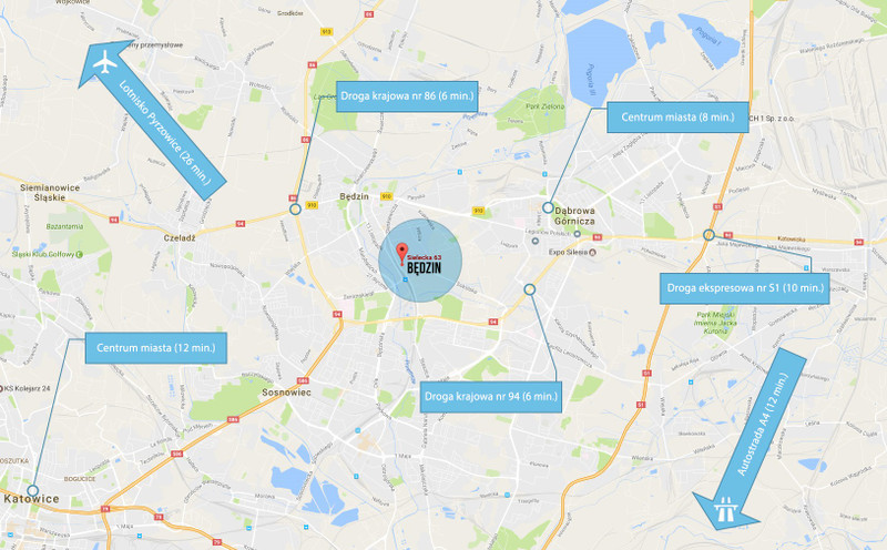 Odległość od najbliższego międzynarodowego portu lotniczego: Katowice - Pyrzowice: 21 km