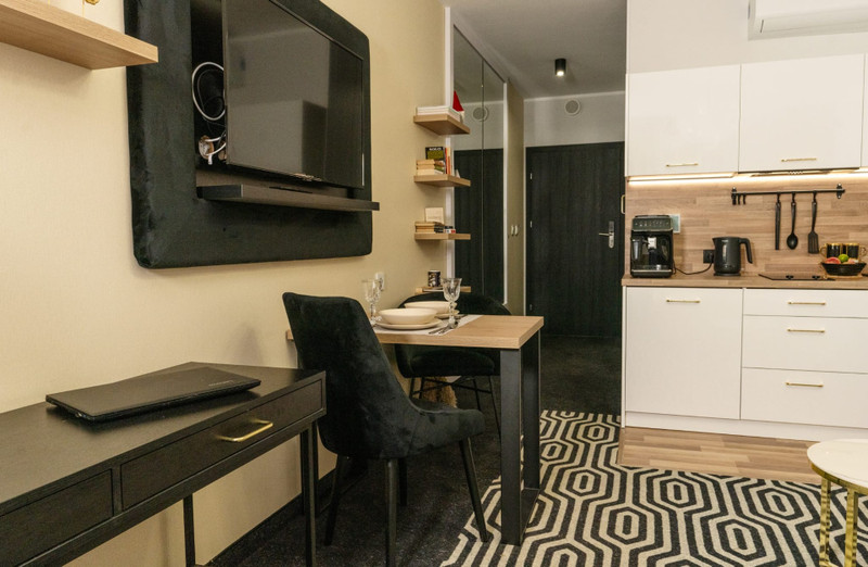 W cenie pozostaje wyposażenie apartamentu wraz z w pełni wyposażonym aneksem kuchennym.