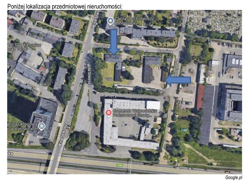 Przedmiotowa nieruchomość położona jest w kwartale wyznaczonym przez ulice: Wita Stwosza – Ks. Bp. Domina – Plebiscytowa. W bezpośrednim sąsiedztwie znajdują się podobne obiekty warsztatowo-magazynowe, zabudowa mieszkaniowa wielorodzinna oraz nowoczesne obiekty Komendy Wojewódzkiej Policji w Katowicach, Komenda Wojewódzka Państwowej Straży Pożarnej, Prokuratura Okręgowa w Katowicach. W odległości ok. 160m w kierunku południowym przebiega autostrada A4.