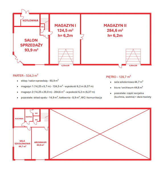 Parter obejmuje salon sprzedaży (93,9 m²) oraz dwa magazyny (124,5 m² i 284,6 m²) o wysokości ponad 6,2 m, z wygodnymi bramami wjazdowymi. Wejście do budynku jest bezprogowe, a przed strefą sprzedaży wyznaczono 2 miejsca parkingowe dla osób niepełnosprawnych.