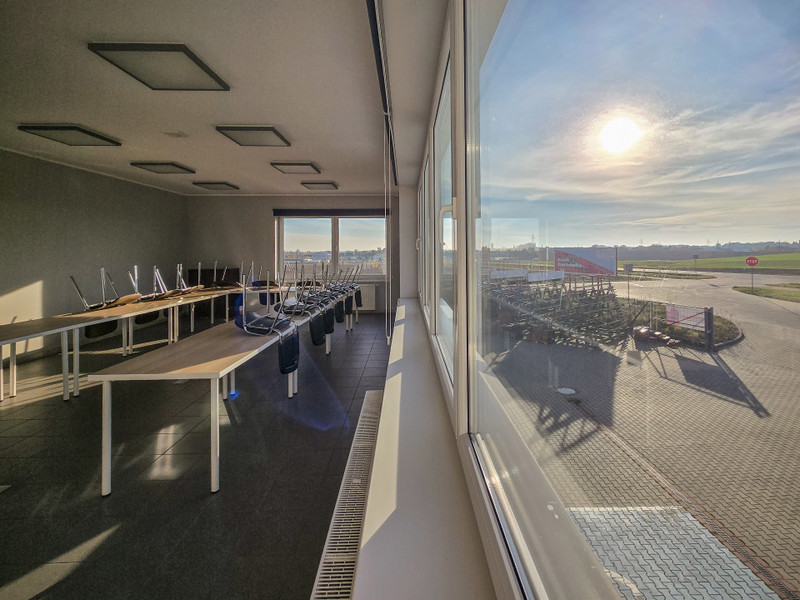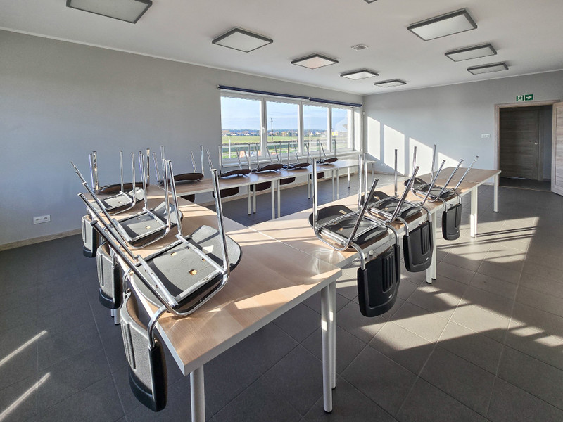 Piętro (128,7 m²) obejmuje przestrzeń biurowo–szkoleniową oraz zaplecze socjalne z kuchnią i toaletami.