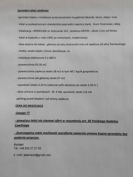 - lokalizacja –WROCŁAW ul. Kościuszki 163 , dzielnica KRZYKI , około 2 km od Rynku