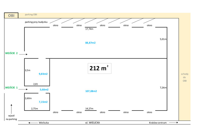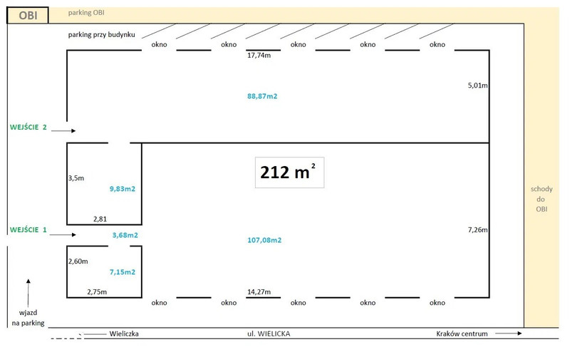 Do wynajęcia lokal/budynek parterowy o łącznej powierzchni 212m2, wysokość 4,5m w najwyższym punkcie a w najniższym 2,7m, składający się z 2 dużych, otwartych przestrzeni 88m2 i 107m2, z osobnymi wejściami oraz WC o pow 7,15m2. Lokal/budynek mieści się w Krakowie bezpośrednio przy ul. Wielickiej, w sąsiedztwie sklepu OBI. W części lokalu o powierzchni 88m2 na podłodze panele, w części o pow 107m2 płyta paździerzowa. Na zdjęciach widoczne jest wyposażenie poprzedniego najemcy, które zostanie usunięte.