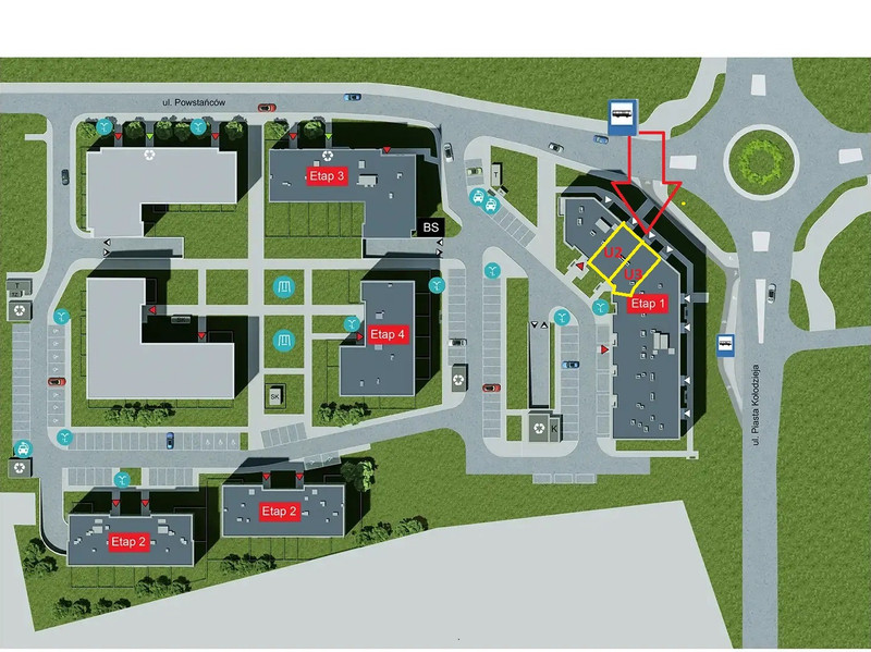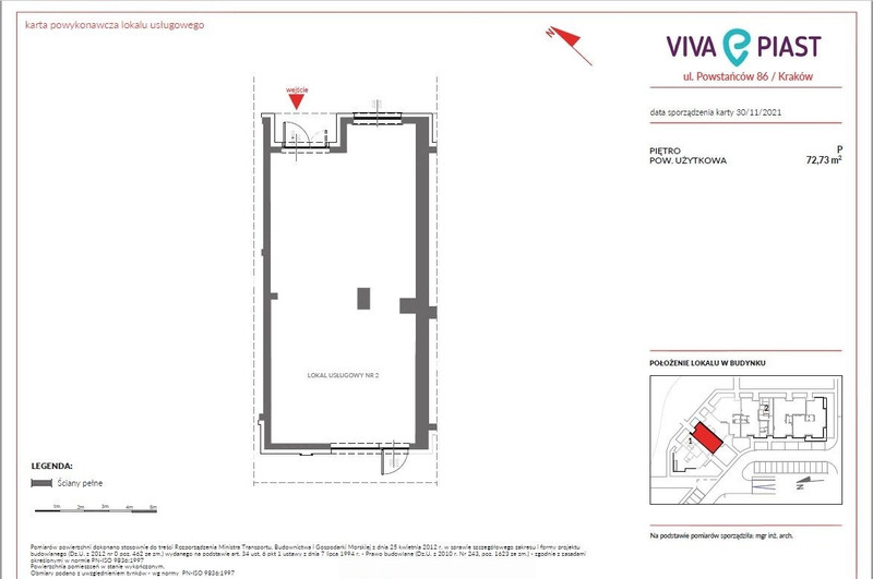 Budynek znajduje się na samym wjeździe do Krakowa od strony Batowic, zjazd z Północnej obwodnicy Krakowa. Po przeciwległej stronie ul. Piasta Kołodzieja będzie realizowana pętla tramwajowa i autobusowa vis-a-vis nowej stacji PKP Kraków Piastów. W okolicy powstało wiele nowych budynków wielorodzinnych, a kolejne są w trakcie realizacji. Przed lokalem znajduje się przystanek autobusowy "Powstańców Wiadukt" linii 193, 260 i 270. Duży ruch.
