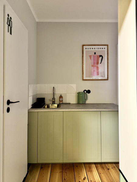• Poczekalnia z aneksem kuchennym wyposażonym w sztućce, talerze, kubki i szklanki