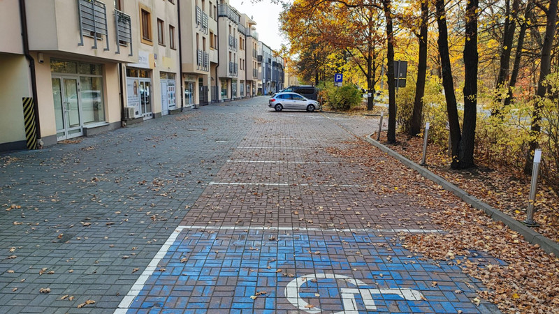 Dwa wjazdy na parking, możliwość dojazdu z obu stron, progi zwalniające.