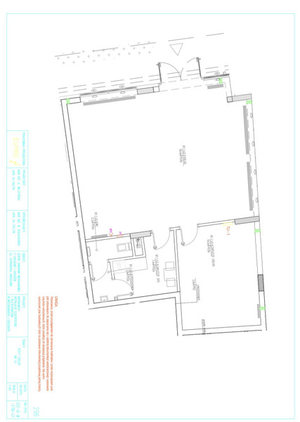 Układ: sala główna, 2 gabinety, łazienka + WC, zaplecze socjalne
