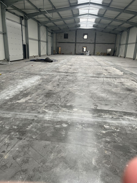 Posadzka betonowa zacierana, pod spodem izolacja XPS 10cm. Trzy bramy wjazdowe. W dachu świetliki izolowane.