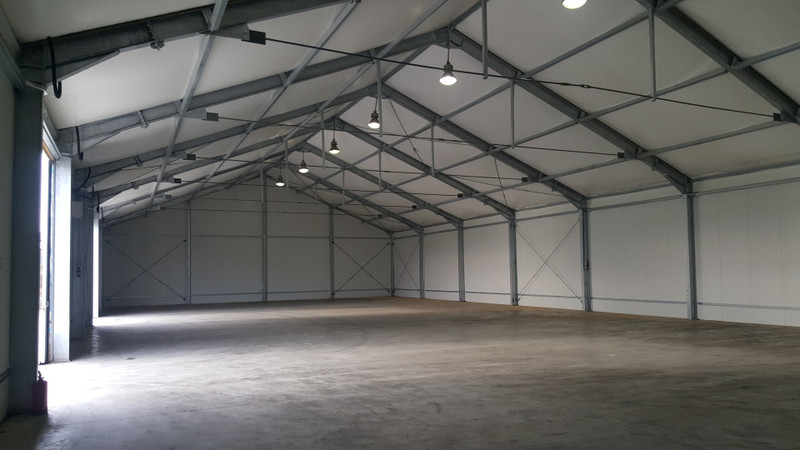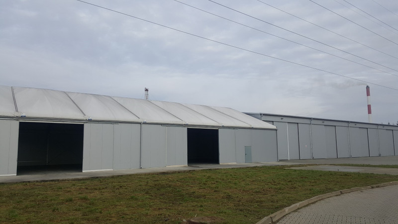 Konstrukcja ocynkowana, płyta warstwowa poliuretan 6 cm, dach dwuspadowy -plandeka pneumatyczna (pompowany), kont nachylenia dachu 22 stopnie, hala bez słupów w środku.