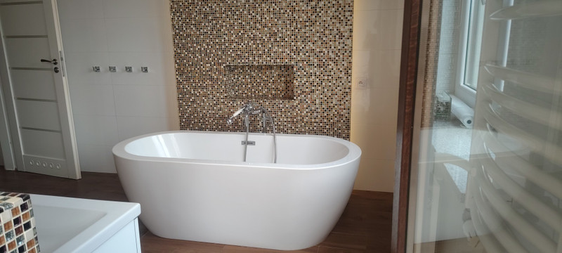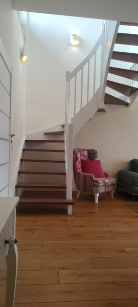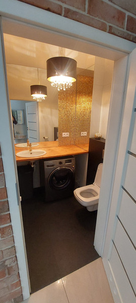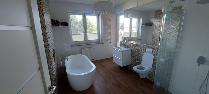 Podłoga w pokojach i przestrzeniach otwartych wykonana z dębowej deski wysokiej jakości, w obu łazienkach glazura i terakota oraz ceramika renomowanych firm.