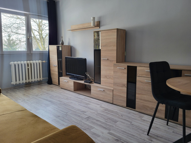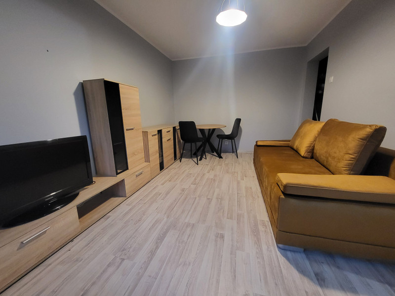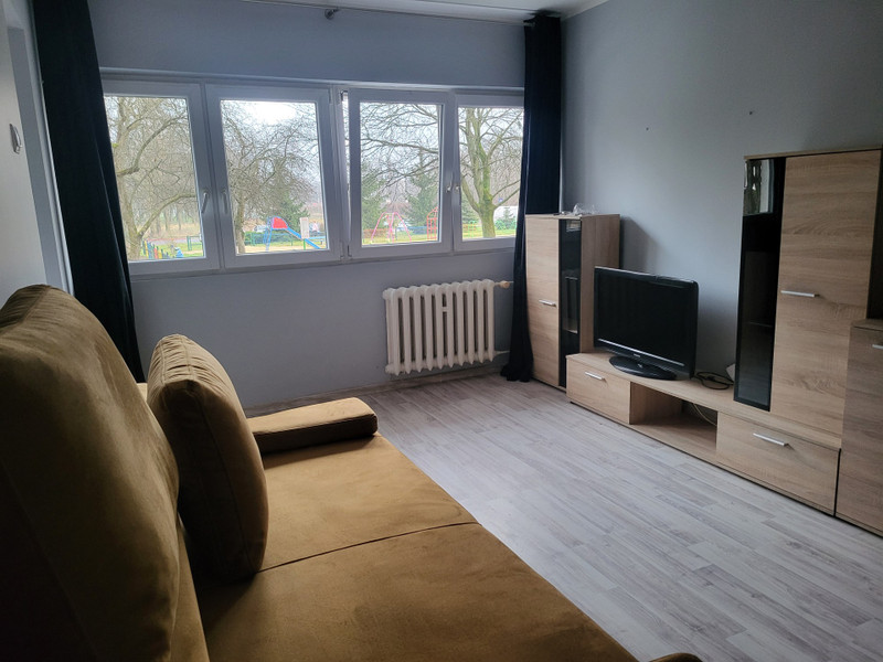 Pokój: gładzie, świeżo odmalowane, sufit G/K, panele, meblościanka, nowiutka kanapa rozkładana i stół z krzesłami.