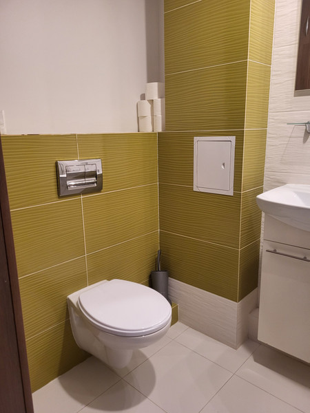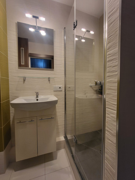 Łazienka: stelaż podtynkowy typu Geberit, muszla wisząca, duża, wygodna kabina wraz z siedziskiem, szafka z umywalką, nowiutka pralka.