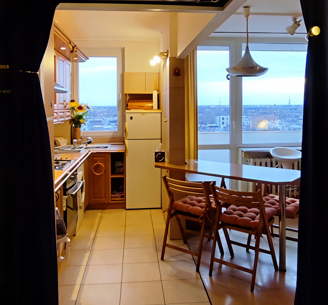 Lokal znajduje się na ostatnim piętrze 10-piętrowego bloku z 1973 roku. W budynku są dwie windy i domofon - dodatkowo na piętrze zamknięty korytarz tylko dla mieszkańców ostatniej kondygnacji. Okna plastikowe zapewniają dobrą izolację. Podłogi wykończone są panelami i wykładziną.