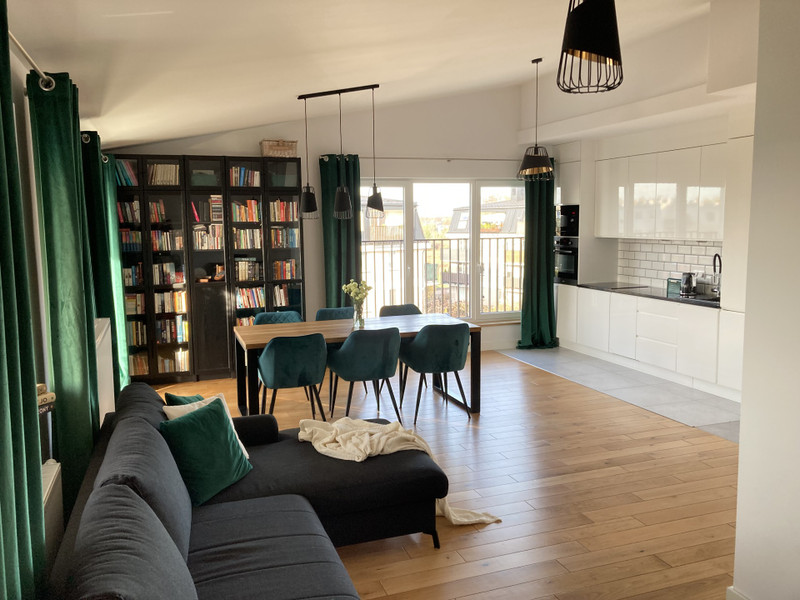• Przestronnego salonu z aneksem kuchennym oraz wyjściem na duży balkon,