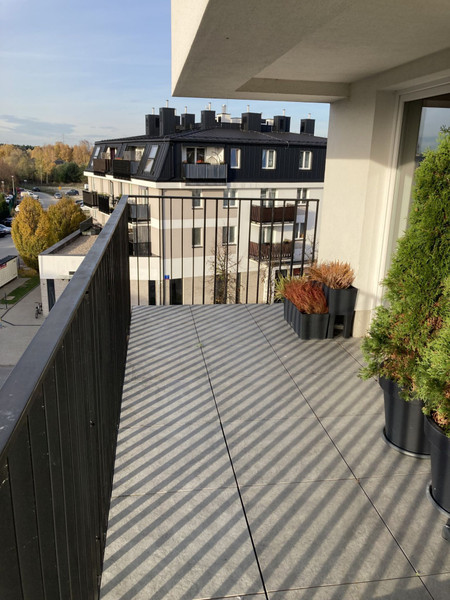 Balkon o powierzchni ok. 14m2 jest zadaszony i posiada sporą wnękę pełniącą funkcję zewnętrznego schowka.