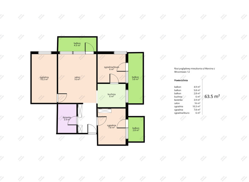 W skład mieszkania wchodzą 3 oddzielne sypialnie plus salon, oddzielna kuchnia z oknem, łazienka oraz TRZY BALKONY
