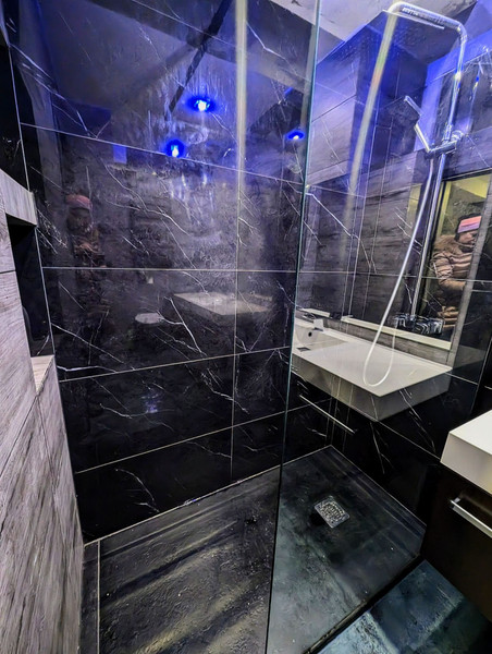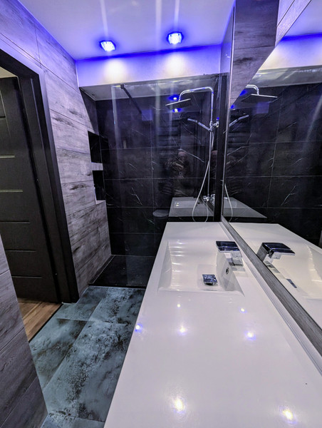 Łazienka o bardzo wysokim standardzie: szklana kabina typu walk-in, brodzik z konglomeratu, płytki mrozoodporne antypoślizgowe sprowadzone pod indywidualne zamówienie, oszczędny piec dwufunkcyjny marki Fondital, oświetlenie punktowe sufitowe barwy niebieskiej. Okno w łazience zapewnia dopływ naturalnego światła. Ogrzewanie gazowe, z piecyka łazienkowego. Własne grzejniki(kaloryfery) plus termostat pozwala na indywidualne dopasowanie temperatury w pomieszczeniach.