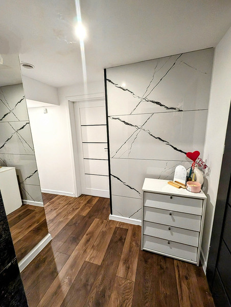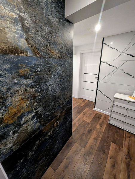 W holu wysokiej jakości panele wodoodporne, laminowane typu na click, z możliwością szybkiej wymiany na inny wzór, na ścianach płytki: wielkoformatowy gres- tworzą niepowtarzalny klimat.