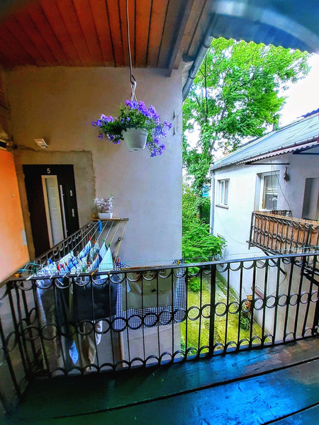 Przed wejściem do mieszkania znajduje się balkon z widokiem na zabytkowe patio, z możliwością tradycyjnego powieszenia prania, czy też chwili relaksu przy porannej kawie albo wieczornym drinku.