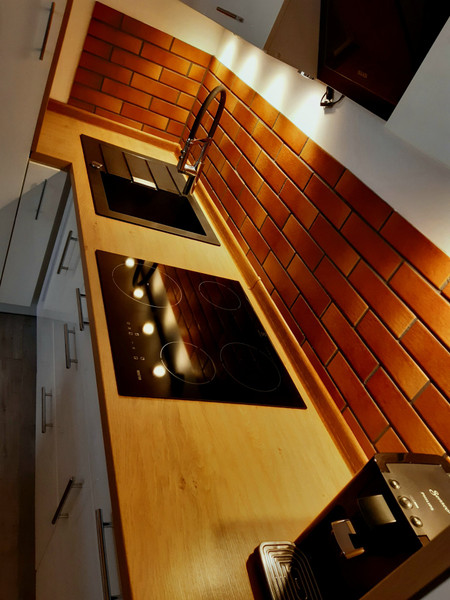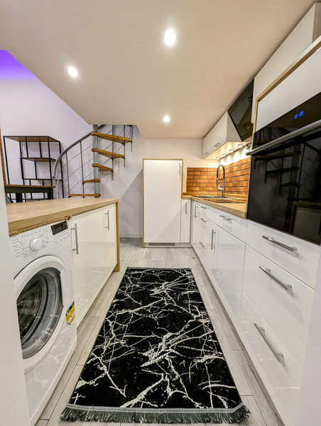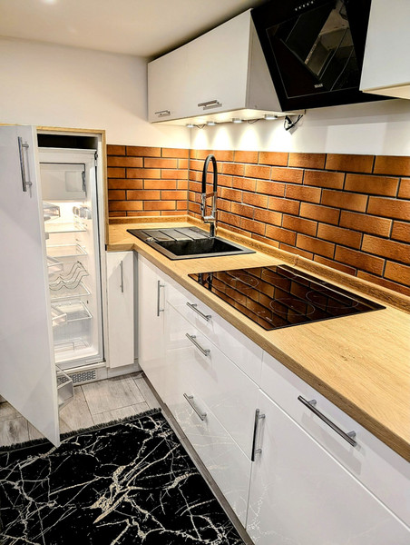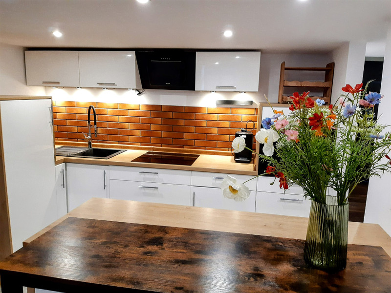 Kuchnia wyposażona w zabudowę, ekspres do kawy, piekarnik, płyta indukcyjna, lodówka, pralka. Brak zmywarki ale jest przygotowane miejsce do jej montażu w zabudowie.