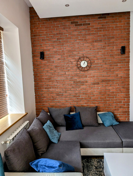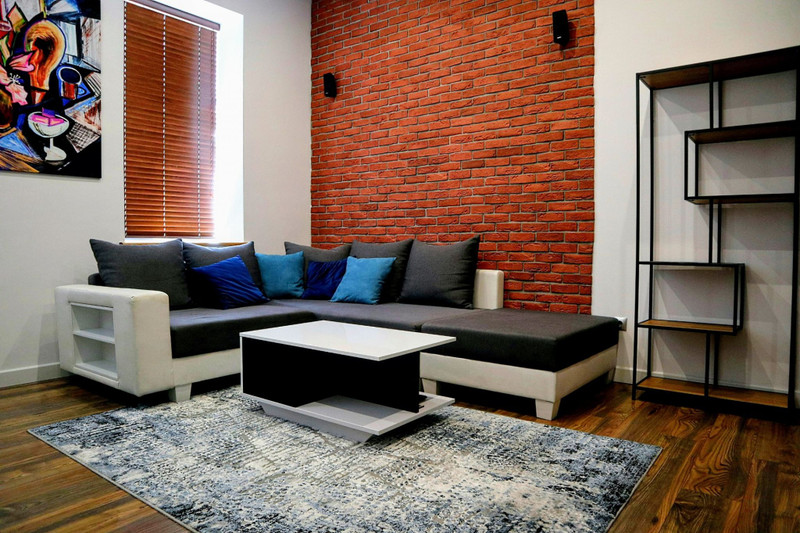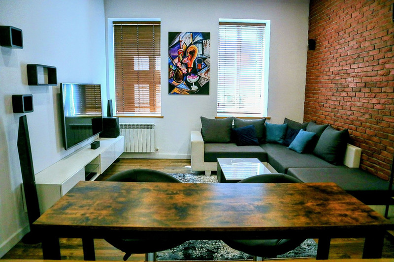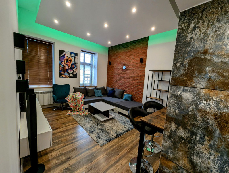 Salon z oświetleniem sufitowym o zmiennych kolorach, sterowane pilotem. W salonie: Kino domowe, skórzany narożnik, szafki rtv, regał na książki, stolik kawowy, barek vintage, skórzane hokery.