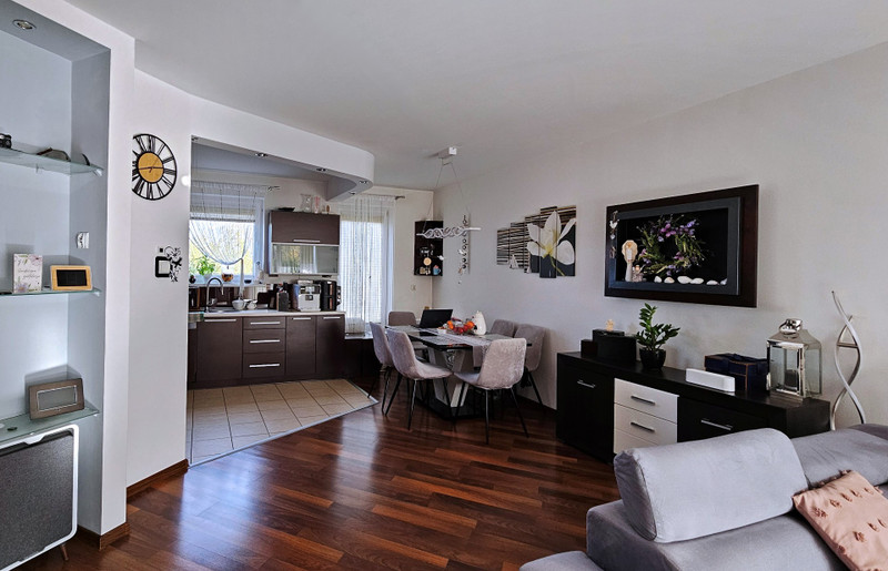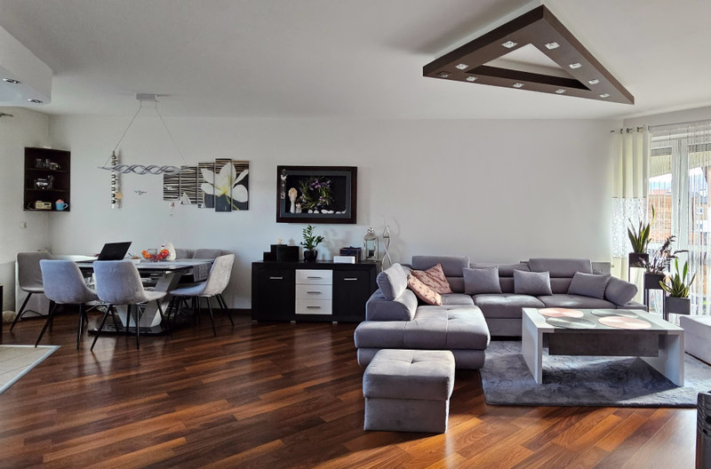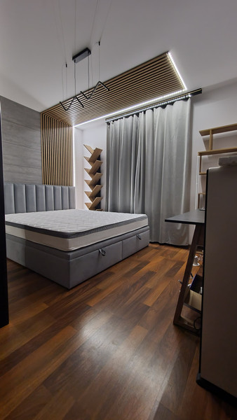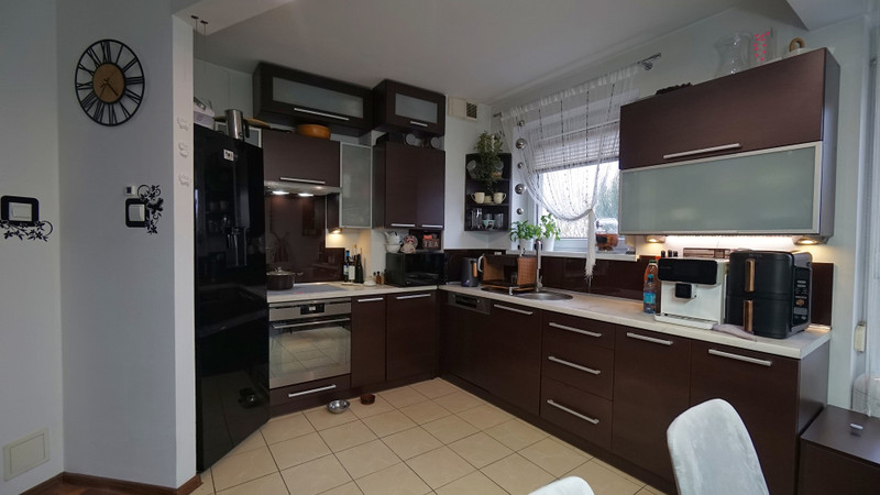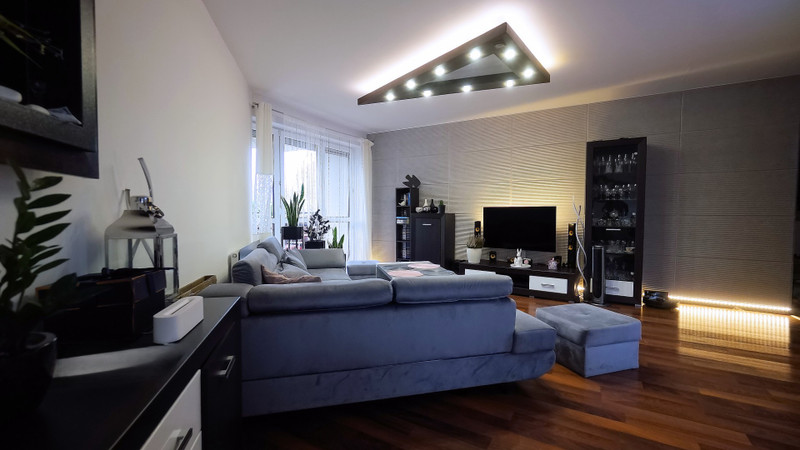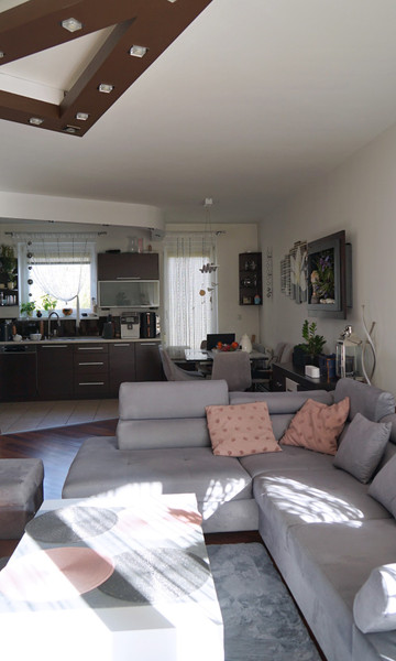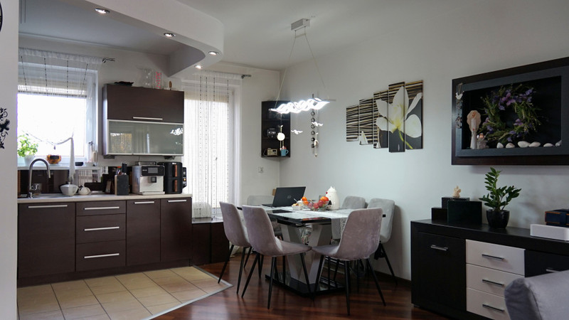 6/ 38,6 mkw bardzo duży i przestronny salon połączony z kuchnią i strefą jadalni. Salon zwężający się w kierunku południowym z wyjściem na balkon przez duże drzwi. W kuchni wszystkie meble robione na zamówienie, markowe AGD (lodówka z zamrażarką Samsung z dyspenserem wody zimnej, piekarnik Amica z ekranem LCD i wieloma programami, zmywarka BOSCH, płyta indukcyjna Indesit w jasnym kolorze). W jadalni rozkładany nowoczesny stół i tapicerowane krzesła oraz duża i jasna lampa LED. W salonie duży komplet wypoczynkowy i meble "salonowe" - barek, słupek na książki, witryna, stolik rtv, wieszak na telewizor. Ściana w dolnej części oraz tył telewizora podświetlany listwą LED RGBW sterowaną z pilota. Podwieszany sufit z podwójnym źródłem światła - codziennym pionowym oraz nastrojowym bocznym. W salonie także robiony na zamówienie duży biokominek na bioetanol, który nie tylko rozgrzewa szybko pomieszczenie, ale pozwala relaksować się oglądając żywy ogień. W oknie kuchennym plisy wewnętrzne regulowane od dołu i od góry, roleta zewnętrzna ocieplana sterowana ręcznie. W oknie jadalni plisy wewnętrzne regulowane od dołu i od góry oraz roleta zewnętrzna ocieplana sterowana ręcznie. Na drzwiach balkonowych roleta zewnętrzna ocieplana sterowana elektrycznie.