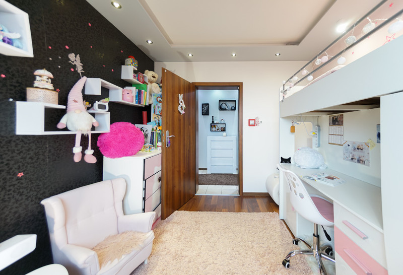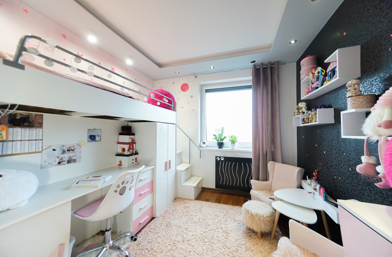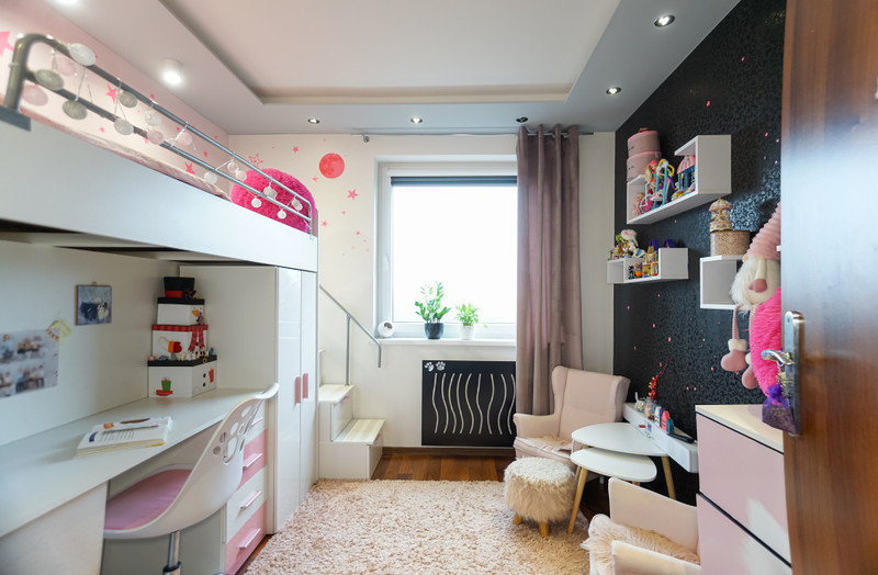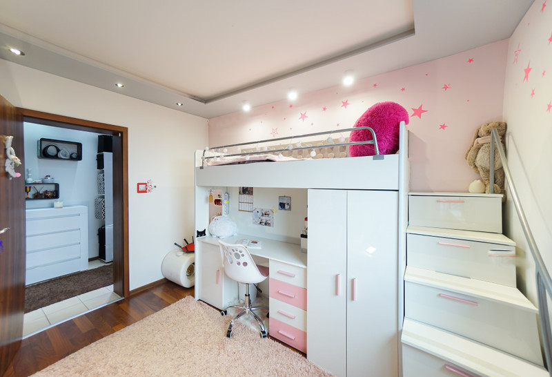 3/ 10 mkw pokój dziecięcy z łóżkiem piętrowym łączącym funkcję spania, biurko, szafę i liczne szuflady ukryte także w schodkach. Liczne naklejki świecące w nocy tworzą niezwykły klimat dla dziecka. Dodatkowo sufit podwieszany z listwą LED RGB do podświetlenia nastrojowego.