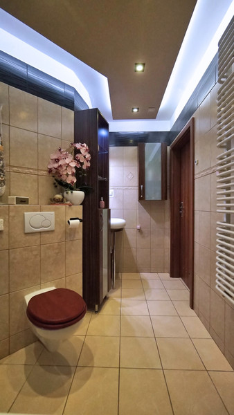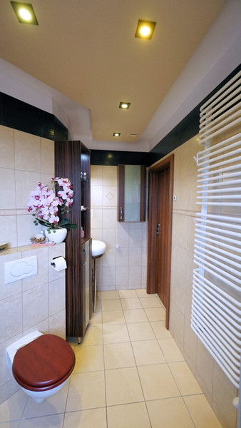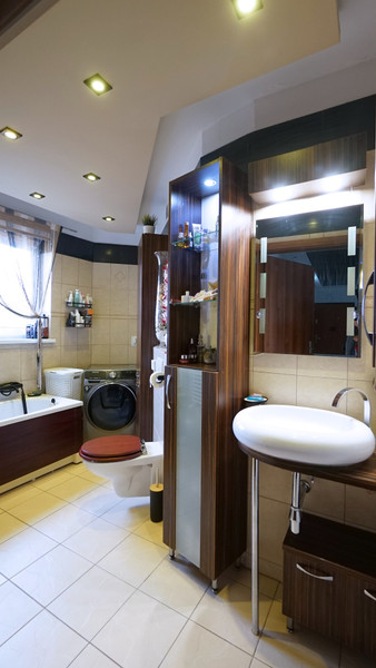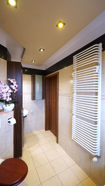 5/ 6,2 mkw łazienka z wanną oraz wielofunkcyjnym panelem prysznicowym. Niecodzienne rozwiązanie, ale łączące komfort z wygodą. Dodatkowo składany szklany "parawan", który zapobiega rozchlapywaniu wody podczas brania prysznica. Meble typu "słupek" i szafki robione na zamówienie. Podwieszany sufit z podwójnym oświetleniem - codziennym pionowym lub bocznym nastrojowym. W oknie roleta wewnętrzna typu dzień-noc.