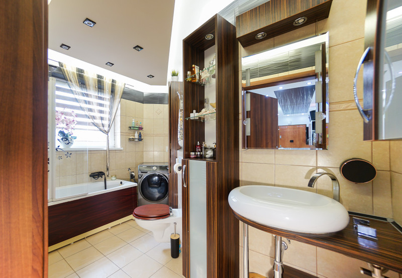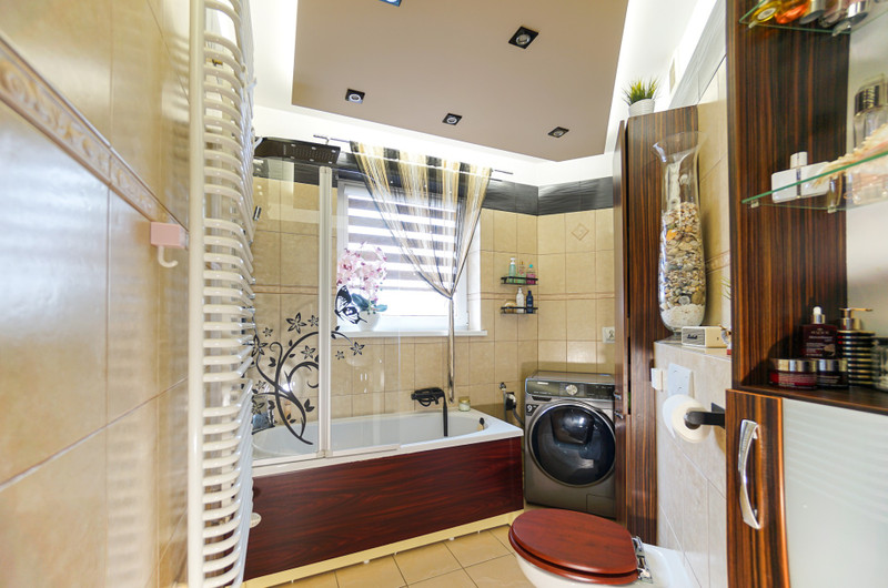 5/ 6,2 mkw łazienka z wanną oraz wielofunkcyjnym panelem prysznicowym. Niecodzienne rozwiązanie, ale łączące komfort z wygodą. Dodatkowo składany szklany "parawan", który zapobiega rozchlapywaniu wody podczas brania prysznica. Meble robione na zamówienie. Podwieszany sufit z podwójnym oświetleniem - codziennym pionowym lub bocznym nastrojowym.