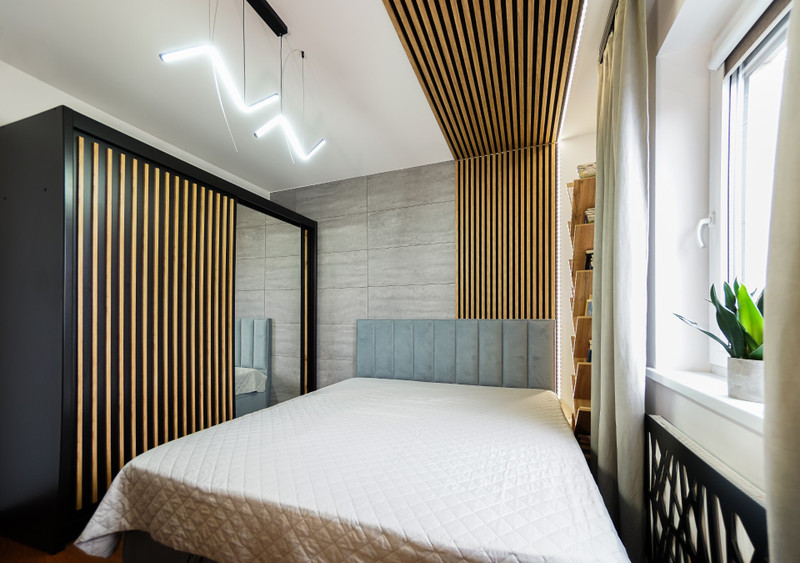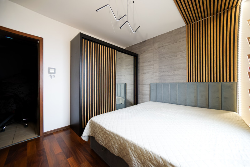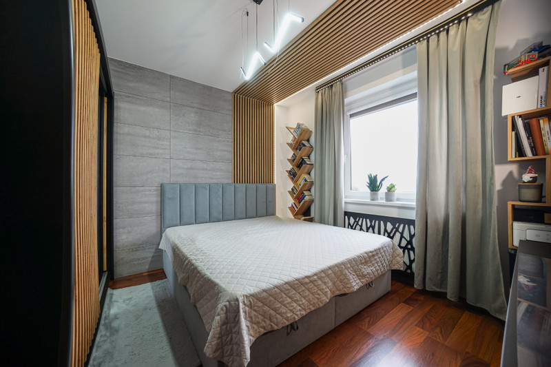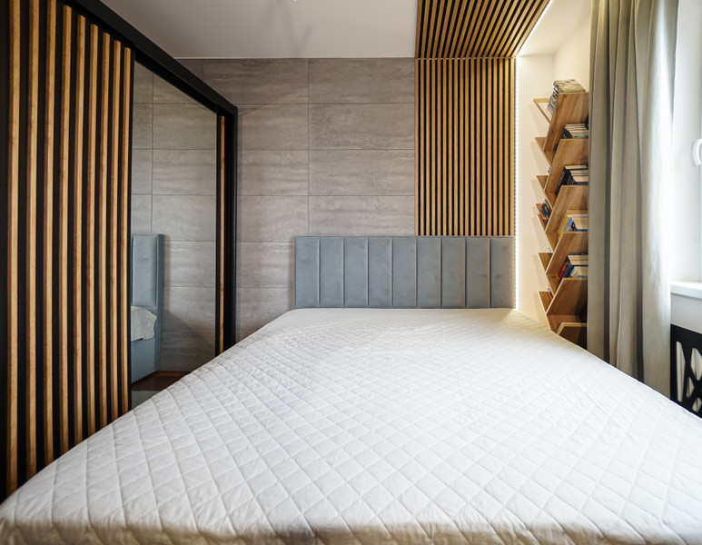 2/ 12,1 mkw sypialnia z dużą szafą i dużym tapicerowanym łóżkiem typu skandynawskiego. W sypialni przewidziano także miejace na biurko komputerowe.