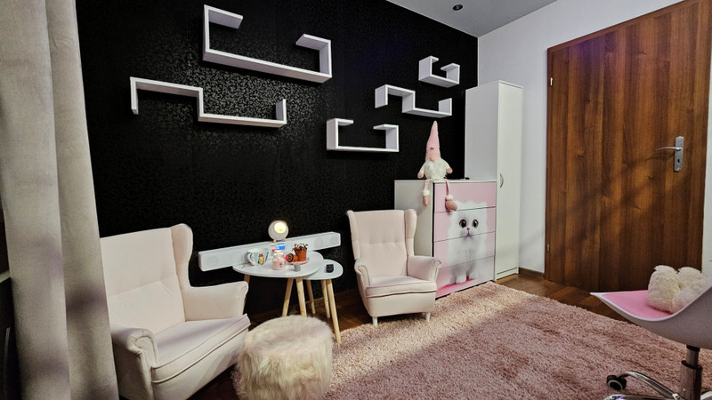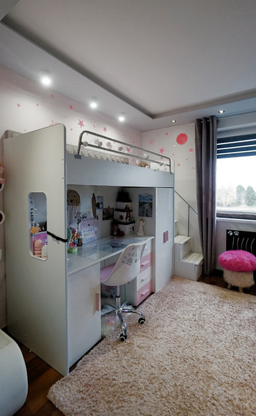 3/ 10 mkw pokój dziecięcy z łóżkiem piętrowym łączącym funkcję spania, biurko, szafę i liczne szuflady ukryte także w schodkach. Liczne naklejki świecące w nocy tworzą niezwykły klimat dla dziecka. Dodatkowo sufit podwieszany z listwą LED RGB do podświetlenia nastrojowego. W oknie roleta wewnętrzna typu dzień-noc oraz roleta zewnętrzna ocieplana sterowana ręcznie.