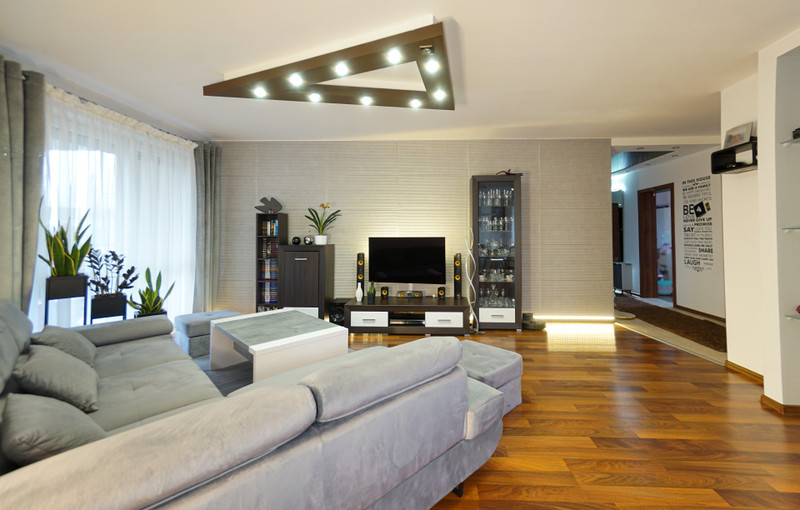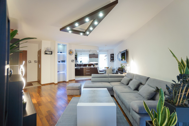 6/ 38,6 mkw bardzo duży i przestronny salon połączony z kuchnią i strefą jadalni. Salon zwężający się w kierunku południowym z wyjściem na balkon przez duże drzwi. W kuchni wszystkie meble robione na zamówienie, markowe AGD. W jadalni rozkładany nowoczesny stół i tapicerowane krzesła oraz duża i jasna lampa LED. W salonie duży komplet wypoczynkowy z szufladą na pościel oraz z funkcją spania, materiał Monolith. Meble "salonowe" - barek, słupek na książki, witryna, stolik rtv, wieszak na telewizor. Ściana w dolnej części oraz tył telewizora podświetlany listwą LED RGBW sterowaną z pilota. Podwieszany sufit z podwójnym źródłem światła - codziennym pionowym oraz nastrojowym bocznym. W salonie także robiony na zamówienie duży biokominek na bioetanol, który nie tylko rozgrzewa szybko pomieszczenie, ale pozwala relaksować się oglądając żywy ogień.