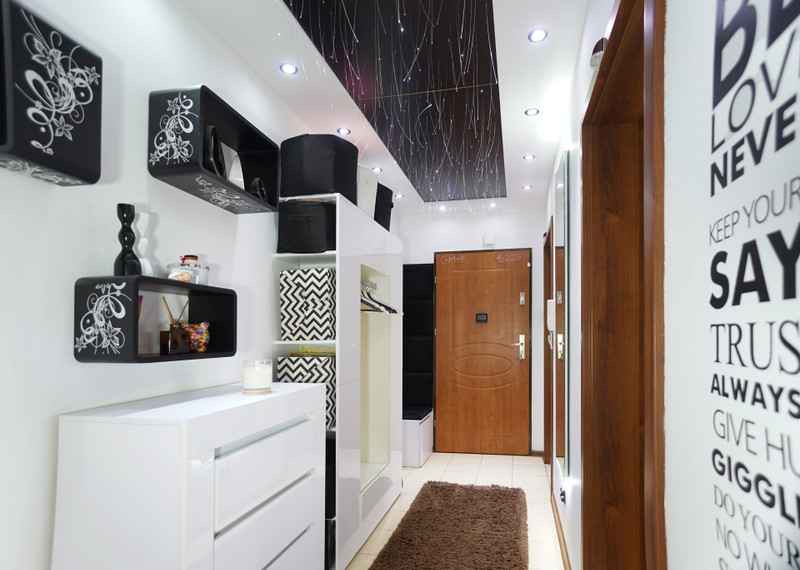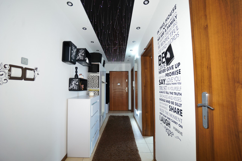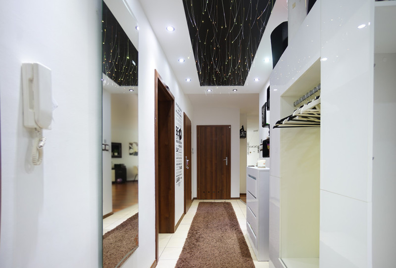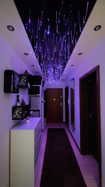1/ 16,6 mkw korytarz wejściowy z sufitem typu gwiezdne niebo, który po prostu robi wrażenie. Światłowody podświetlane światłem RGB LED. Duże lustro podświetlane, szafa na ubrania, tapicerowany kącik z siedziskiem i oparciem, komoda na buty.