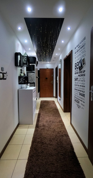 1/ 16,6 mkw korytarz wejściowy z sufitem typu gwiezdne niebo, który po prostu robi wrażenie. Światłowody podświetlane światłem RGB LED. Duże lustro robione na zamówienie, podświetlane. Szafa na ubrania, tapicerowany kącik z siedziskiem i oparciem, komoda na buty.